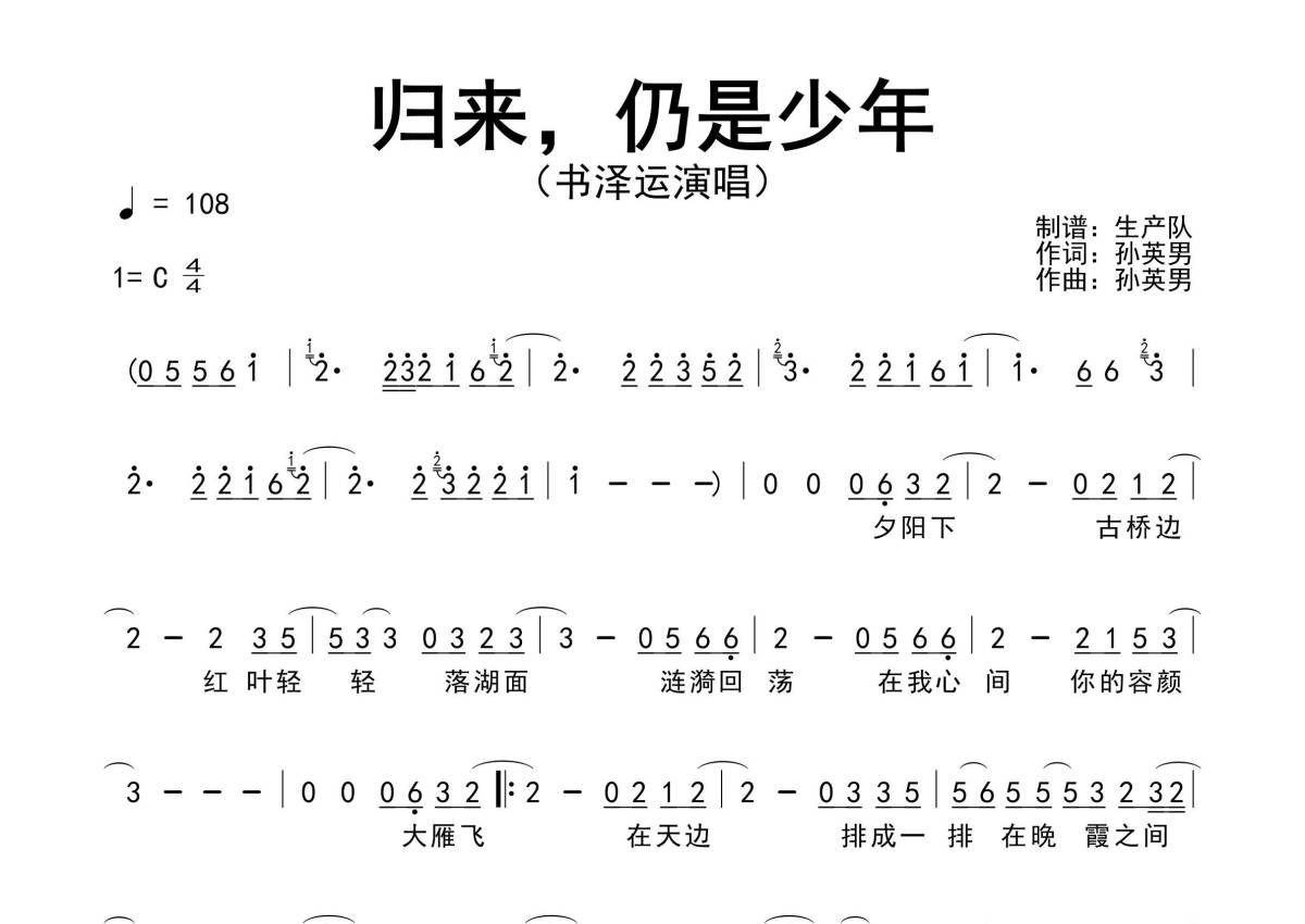 《归来,仍是少年》是书泽运演唱的一首歌曲,原版简谱,拍号为4/4拍,歌曲速度为每分钟108拍,这份简谱共有两张高清图谱,图谱由 @生产队 编配上传。