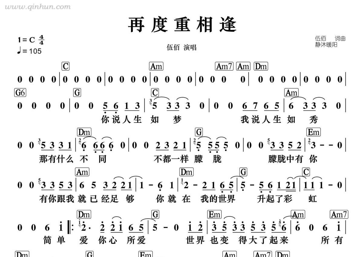 《再度重相逢》是伍佰演唱的一首歌曲,带和弦版,拍号为4/4拍,这份简谱共有一张高清图谱,图谱由 @静沐暖阳 编配上传。