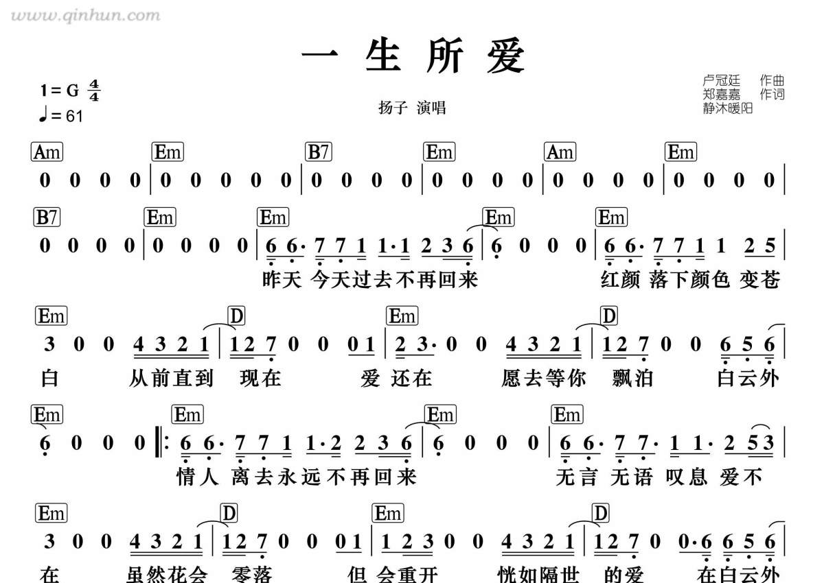 《一生所爱》是扬子演唱的一首歌曲,带和弦版,拍号为4/4拍,这份简谱共有一张高清图谱,图谱由 @静沐暖阳 编配上传。