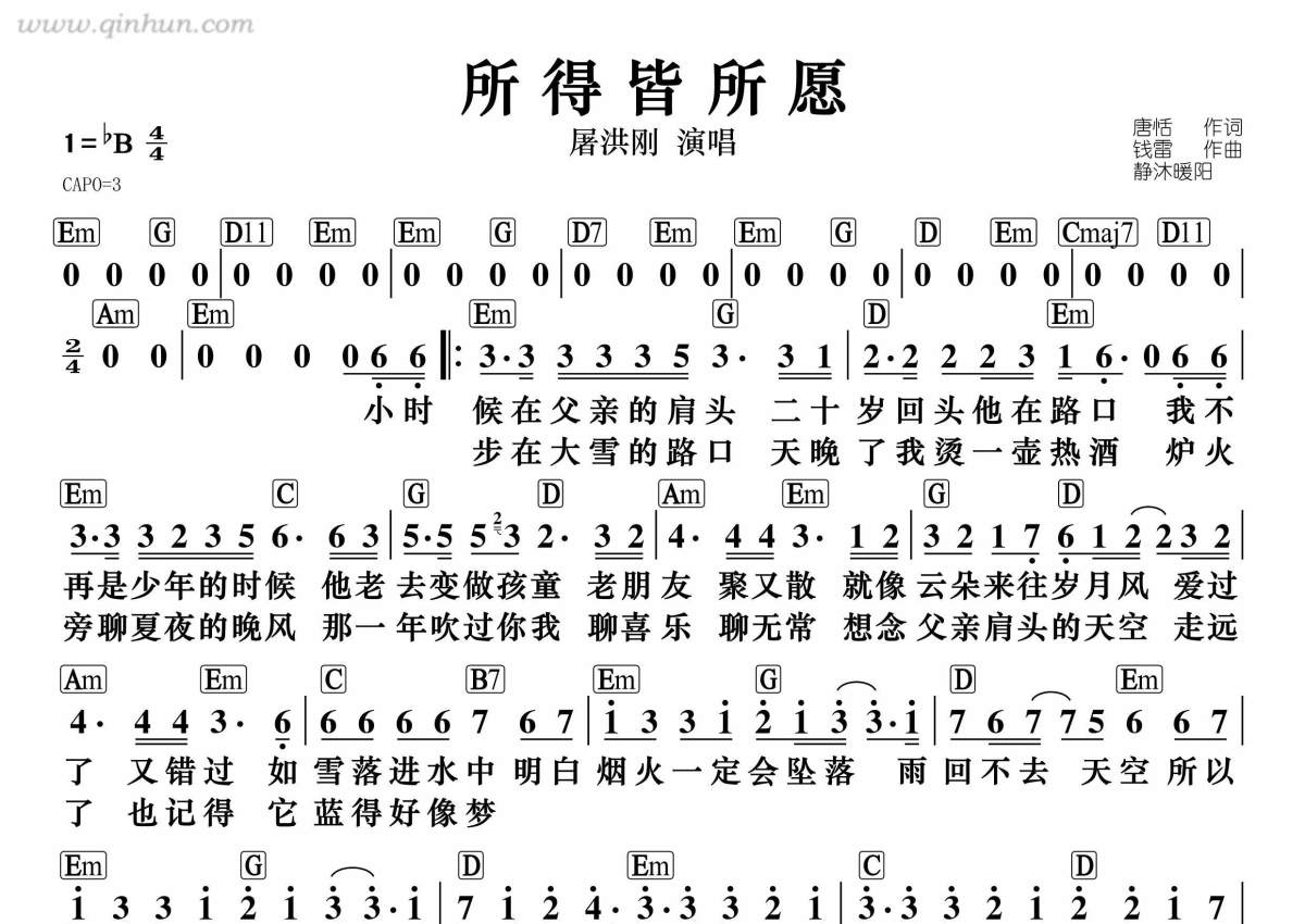 《所得皆所愿》是屠洪刚演唱的一首歌曲,带和弦版,拍号为4/4拍,这份简谱共有一张高清图谱,图谱由 @静沐暖阳 编配上传。