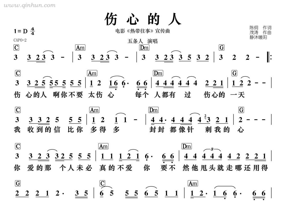 《伤心的人》是五条人演唱的一首歌曲,带和弦版,拍号为4/4拍,这份简谱共有一张高清图谱,图谱由 @静沐暖阳 编配上传。
