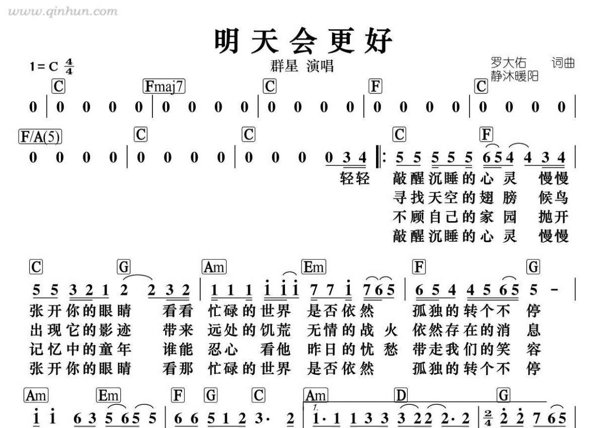 《明天会更好》是群星演唱的一首歌曲,带和弦版,拍号为4/4拍,这份简谱共有一张高清图谱,图谱由 @静沐暖阳 编配上传。