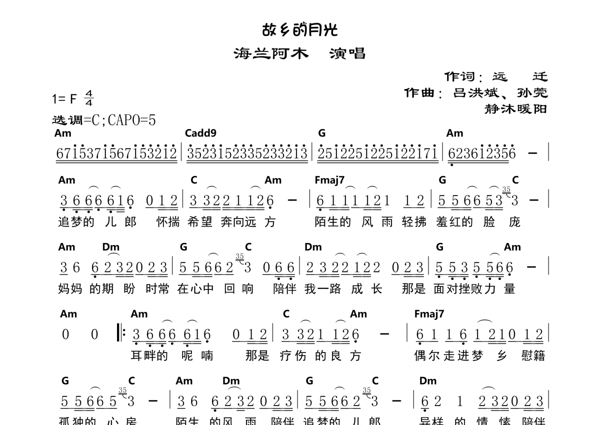 海来阿木《故乡的月光》简谱 - 带和弦版