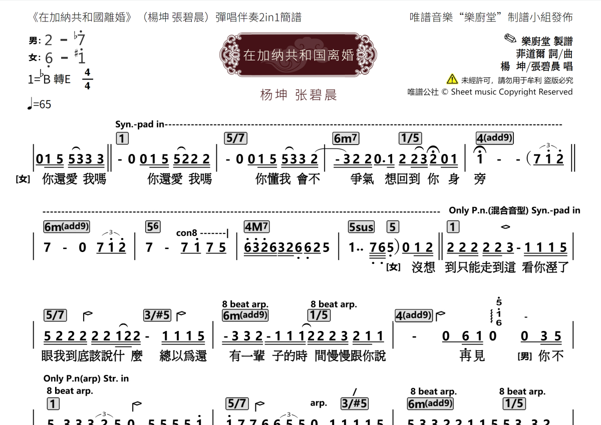 《在加纳共和国离婚》是杨坤/张碧晨演唱的一首歌曲,拍号为4/4拍,歌曲速度为每分钟65拍,这份乐队总谱共有三张高清图谱,图谱由 @唯谱音乐"乐厨堂"发布小组 编配上传职业LIVE乐手伴奏谱,同时适合标准四大件乐队和专业歌手的排练参考以及原版的即兴伴奏。