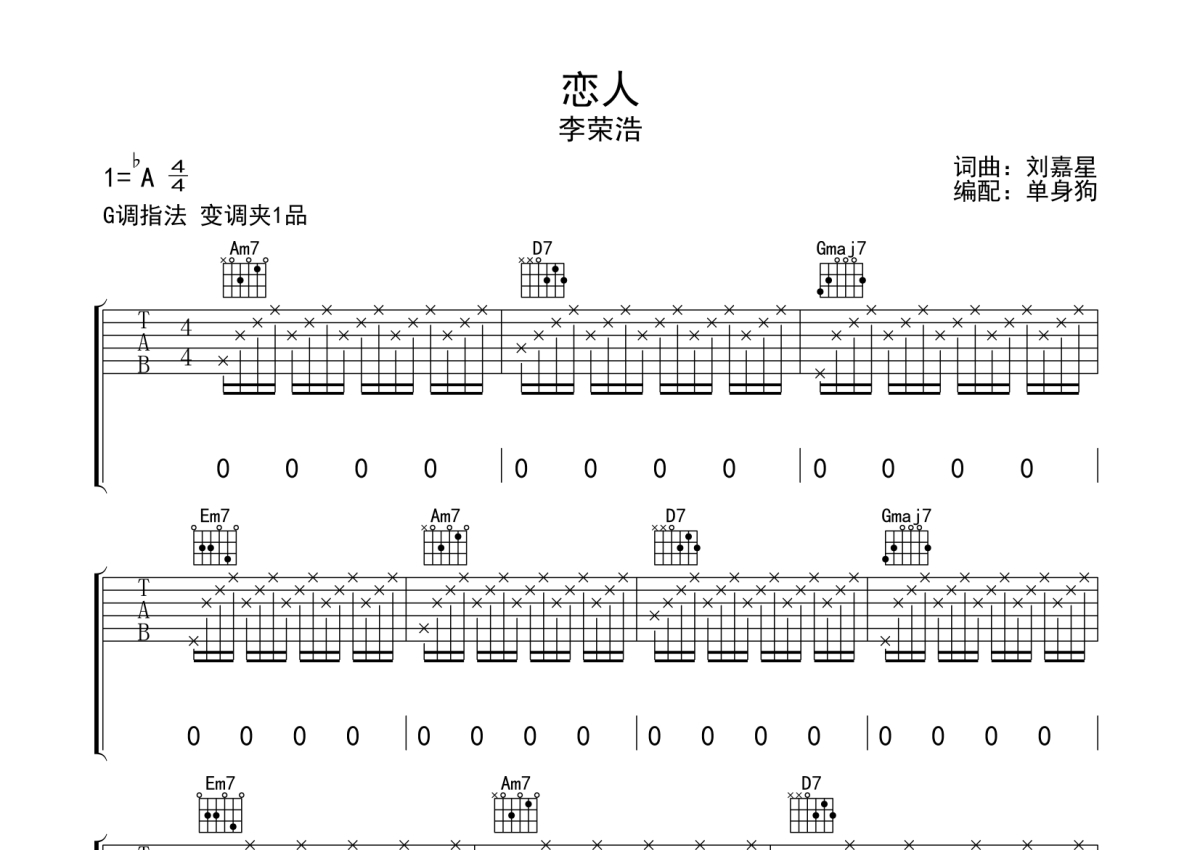 《恋人》是李荣浩演唱的一首歌曲,拍号为4/4拍,歌曲原调为Ab调,但由于原调指法比较难,为了方便弹奏,本吉他谱采用的是G调指法编配,变调夹1品弹奏即为原调,当然也可以根据自己的音域改变变调夹位置,或者通过改变和弦调性,以方便自己弹奏,这份吉他谱共有四张高清图谱,图谱由 @单身狗 编配上传,图谱使用六线谱编配,包含吉他和弦指法、简谱以及歌词部分,使用这份恋人吉他谱,可以让你更加方便地掌握这首歌曲的弹唱技巧,快来尝试吧。