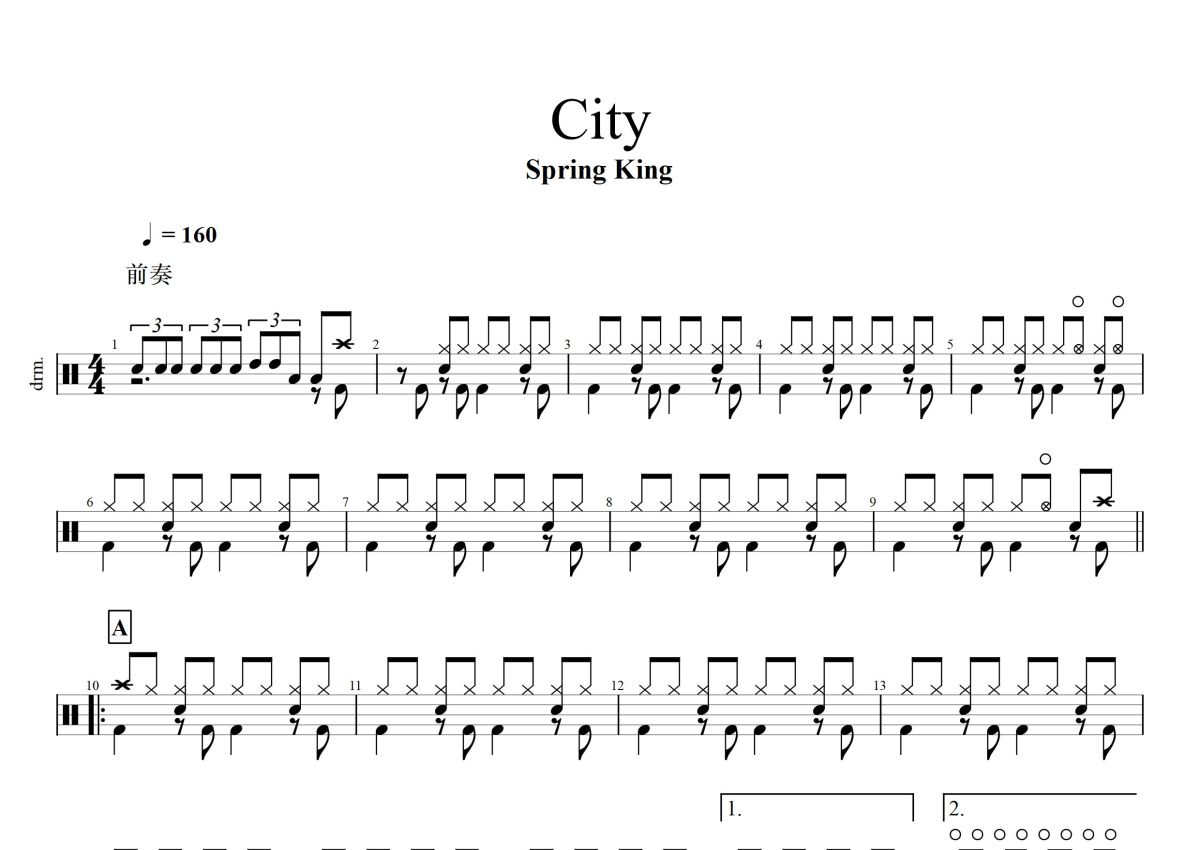 《City》是Spring King演唱的一首歌曲,这份鼓谱共有三张高清图谱,图谱由 @打鼓谱 编配上传,图谱使用五线谱编配,使用这份City架子鼓谱,你将能够轻松地敲打出这首Spring King的City,快来尝试吧。首张收录专辑: Tell Me If You Like To 发行时间: 2016 年 。