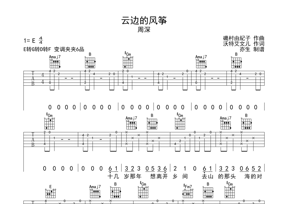 周深《云边的风筝》吉他谱 - E调弹唱六线谱