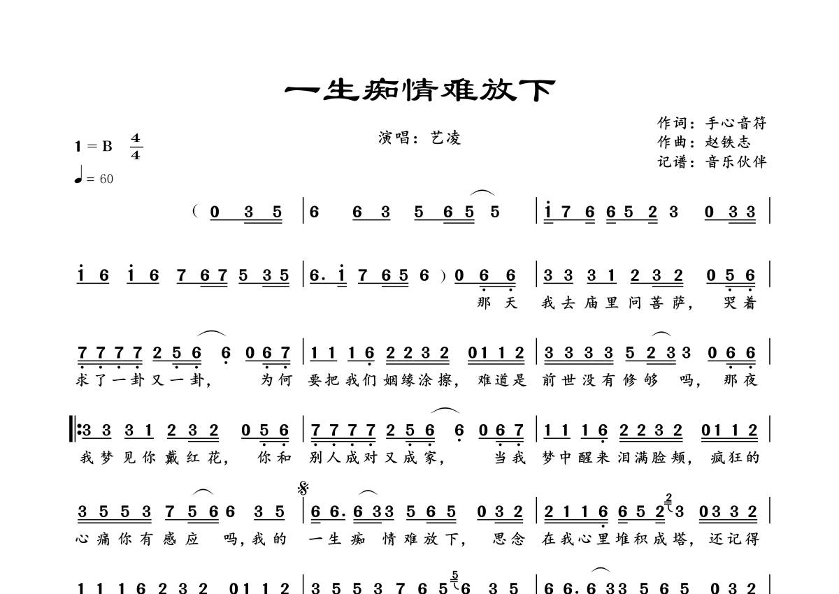 《一生痴情难放下》是艺凌演唱的一首歌曲,拍号为4/4拍,歌曲速度为每分钟60拍,这份简谱共有一张高清图谱,图谱由 @音乐伙伴 编配上传。