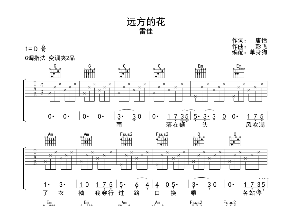 《远方的花》是雷佳演唱的一首歌曲,拍号为6/8拍,歌曲原调为D调,但由于原调指法比较难,为了方便弹奏,本吉他谱采用的是C调指法编配,变调夹2品弹奏即为原调,当然也可以根据自己的音域改变变调夹位置,或者通过改变和弦调性,以方便自己弹奏,这份吉他谱共有五张高清图谱,图谱由 @单身狗 编配上传,图谱使用六线谱编配,包含吉他和弦指法、简谱以及歌词部分,使用这份远方的花吉他谱,可以让你更加方便地掌握这首歌曲的弹唱技巧,快来尝试吧。