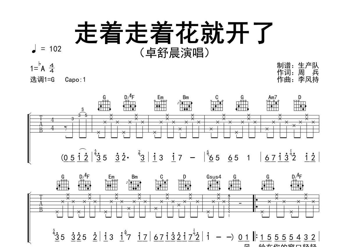《走着走着花就开了》是卓舒晨演唱的一首歌曲,精编完美版,拍号为4/4拍,歌曲速度为每分钟102拍,歌曲原调为Ab调,但由于原调指法比较难,为了方便弹奏,本吉他谱采用的是G调指法编配,变调夹1品弹奏即为原调,当然也可以根据自己的音域改变变调夹位置,或者通过改变和弦调性,以方便自己弹奏,这份吉他谱共有三张高清图谱,图谱由 @生产队 编配上传,图谱使用六线谱编配,包含吉他和弦指法、简谱以及歌词部分,使用这份走着走着花就开了吉他谱,可以让你更加方便地掌握这首歌曲的弹唱技巧,快来尝试吧。