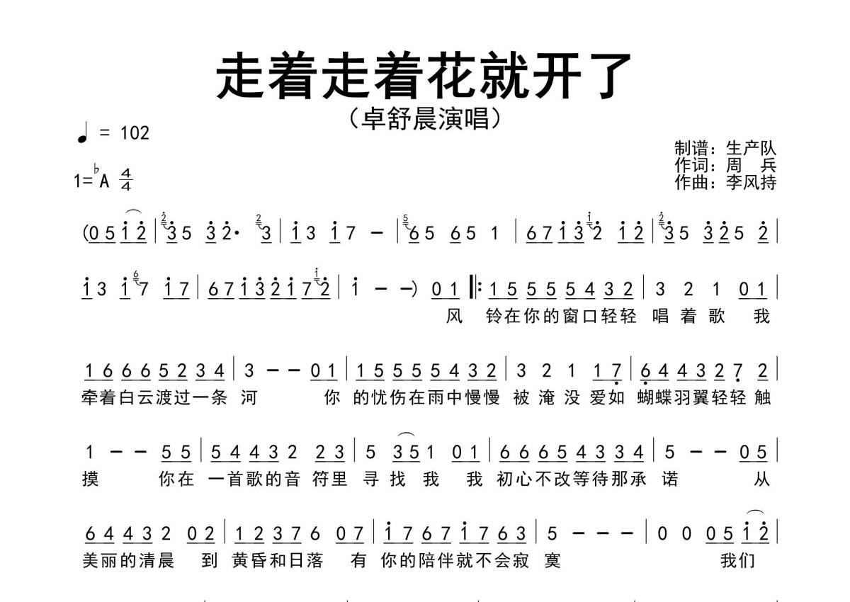 《走着走着花就开了》是卓舒晨演唱的一首歌曲,原版简谱,拍号为4/4拍,歌曲速度为每分钟102拍,这份简谱共有一张高清图谱,图谱由 @生产队 编配上传。