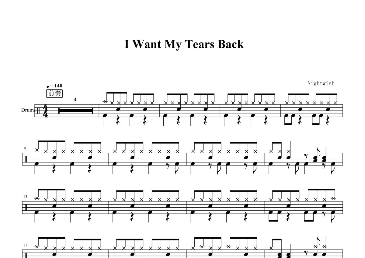 《I Want My Tears Back》是Nightwish演唱的一首歌曲,这份鼓谱共有六张高清图谱,图谱由 @打鼓谱 编配上传,图谱使用五线谱编配,使用这份I Want My Tears Back架子鼓谱,你将能够轻松地敲打出这首Nightwish的I Want My Tears Back,快来尝试吧。《I Want My Tears Back》是出自Nightwish的第七张录音室专辑《IMAGINAERUM》,主唱是Anette Olzon,已经在2012年1月发行。与新专辑相关的同名音乐幻想电影将于2012年8月上映。Nightwish(夜愿,港台译名“日暮颂歌”)是一支成立于1996年来自芬兰的剧院金属(美声金属)乐队。