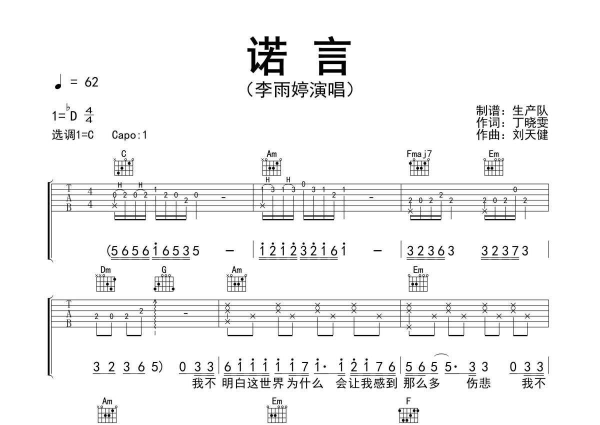 《诺言》是李雨婷演唱的一首歌曲,精编完美版,拍号为4/4拍,歌曲速度为每分钟62拍,歌曲原调为Db调,但由于原调指法比较难,为了方便弹奏,本吉他谱采用的是C调指法编配,变调夹1品弹奏即为原调,当然也可以根据自己的音域改变变调夹位置,或者通过改变和弦调性,以方便自己弹奏,这份吉他谱共有三张高清图谱,图谱由 @生产队 编配上传,图谱使用六线谱编配,包含吉他和弦指法、简谱以及歌词部分,使用这份诺言吉他谱,可以让你更加方便地掌握这首歌曲的弹唱技巧,快来尝试吧。《诺言》是由李雨婷翻唱的柔情版本。天籁好听,歌声深情动人。本吉他谱根据原版C调指法编配,完整的前奏、间奏、尾奏和solo编配,值得推荐品味!。
