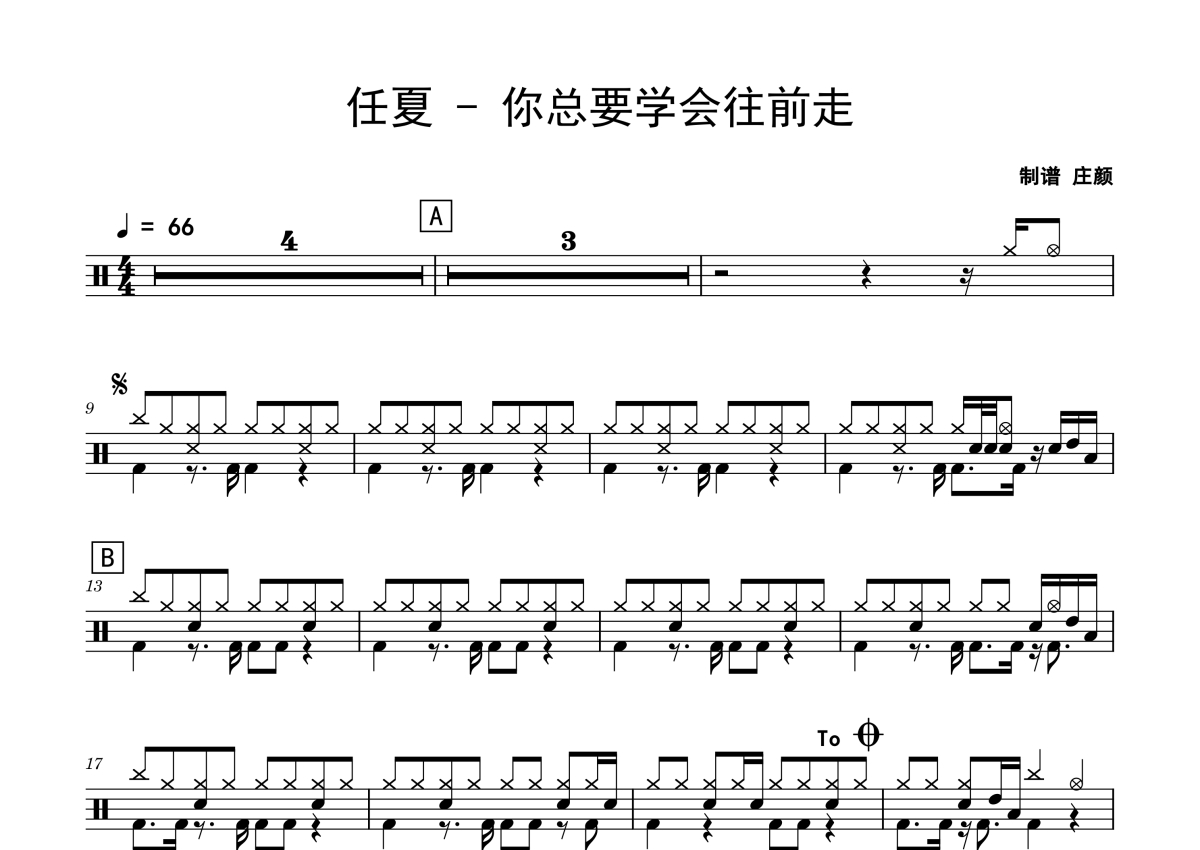 《你总要学会往前走》是任夏演唱的一首歌曲,拍号为4/4拍,歌曲速度为每分钟66拍,这份架子鼓谱共有一张高清图谱,图谱由 @庄颜 编配上传,图谱使用五线谱编配,使用这份你总要学会往前走架子鼓谱,你将能够轻松地敲打出这首任夏的你总要学会往前走,快来尝试吧。