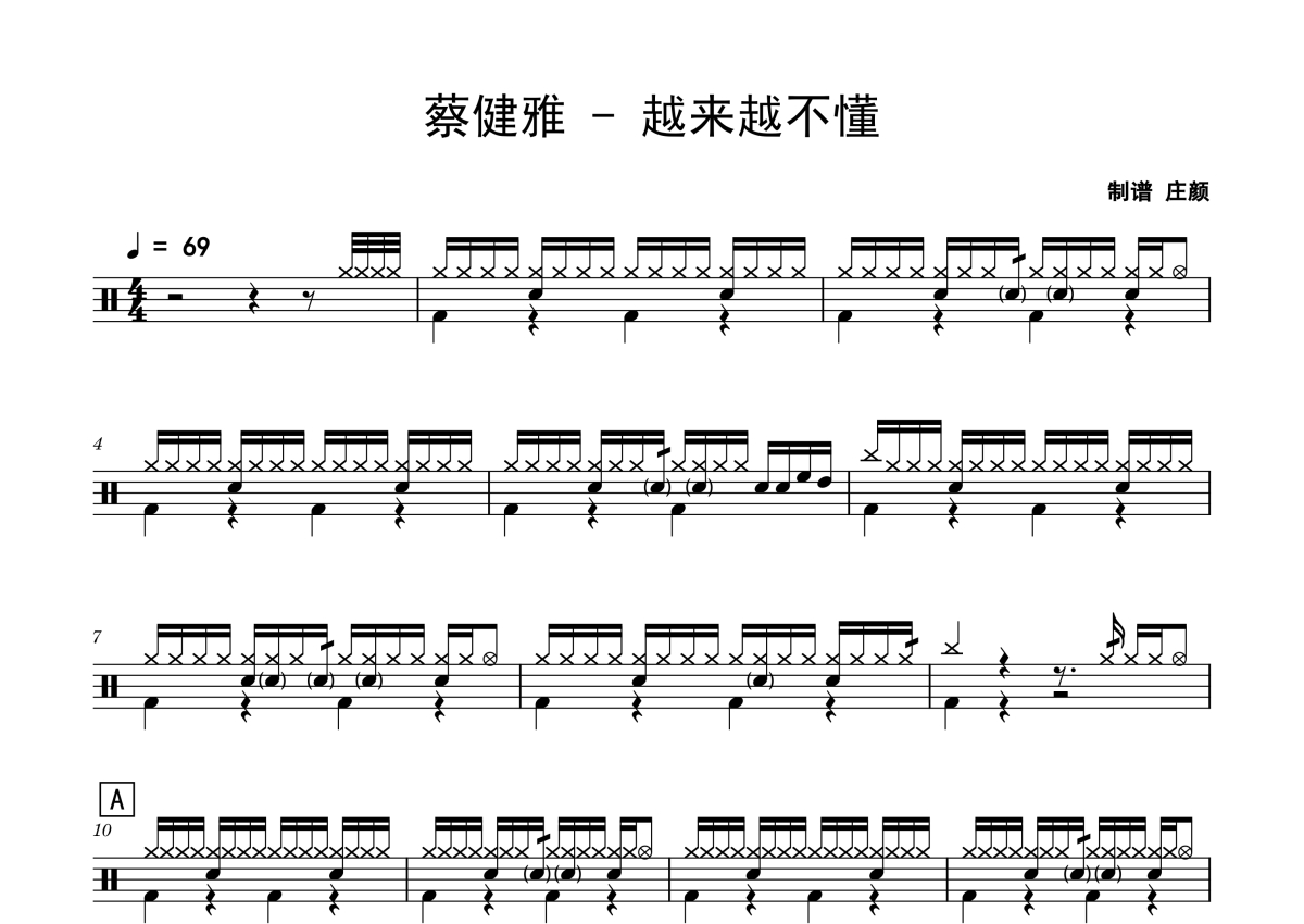 《越来越不懂》是蔡健雅演唱的一首歌曲,这份架子鼓谱共有三张高清图谱,图谱由 @庄颜 编配上传,图谱使用五线谱编配,使用这份越来越不懂架子鼓谱,你将能够轻松地敲打出这首蔡健雅的越来越不懂,快来尝试吧。