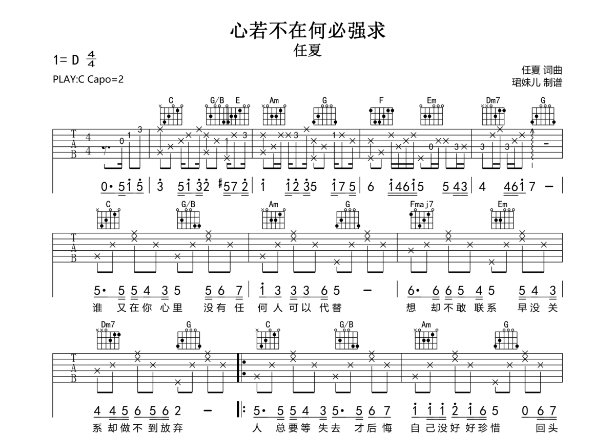 心若不在何必强求吉他谱 - 任夏 - C调弹唱六线谱