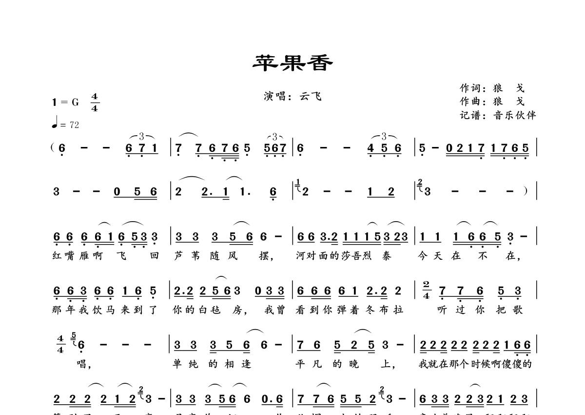 《苹果香》是云飞演唱的一首歌曲,拍号为4/4拍,歌曲速度为每分钟72拍,这份简谱共有两张高清图谱,图谱由 @音乐伙伴 编配上传。