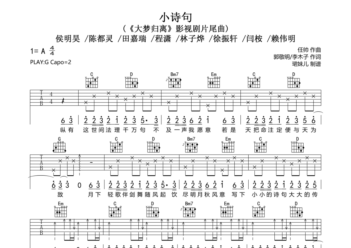 《小诗句》是侯明昊/陈都灵/田嘉瑞/程潇/林子烨/徐振轩/闫桉/赖伟明演唱的一首歌曲,拍号为4/4拍,歌曲速度为每分钟85拍,歌曲原调为A调,但由于原调指法比较难,为了方便弹奏,本吉他谱采用的是G调指法编配,变调夹2品弹奏即为原调,当然也可以根据自己的音域改变变调夹位置,或者通过改变和弦调性,以方便自己弹奏,这份吉他谱共有两张高清图谱,图谱由 @珺妹儿 编配上传,图谱使用六线谱编配,包含吉他和弦指法、简谱以及歌词部分,使用这份小诗句吉他谱,可以让你更加方便地掌握这首歌曲的弹唱技巧,快来尝试吧。