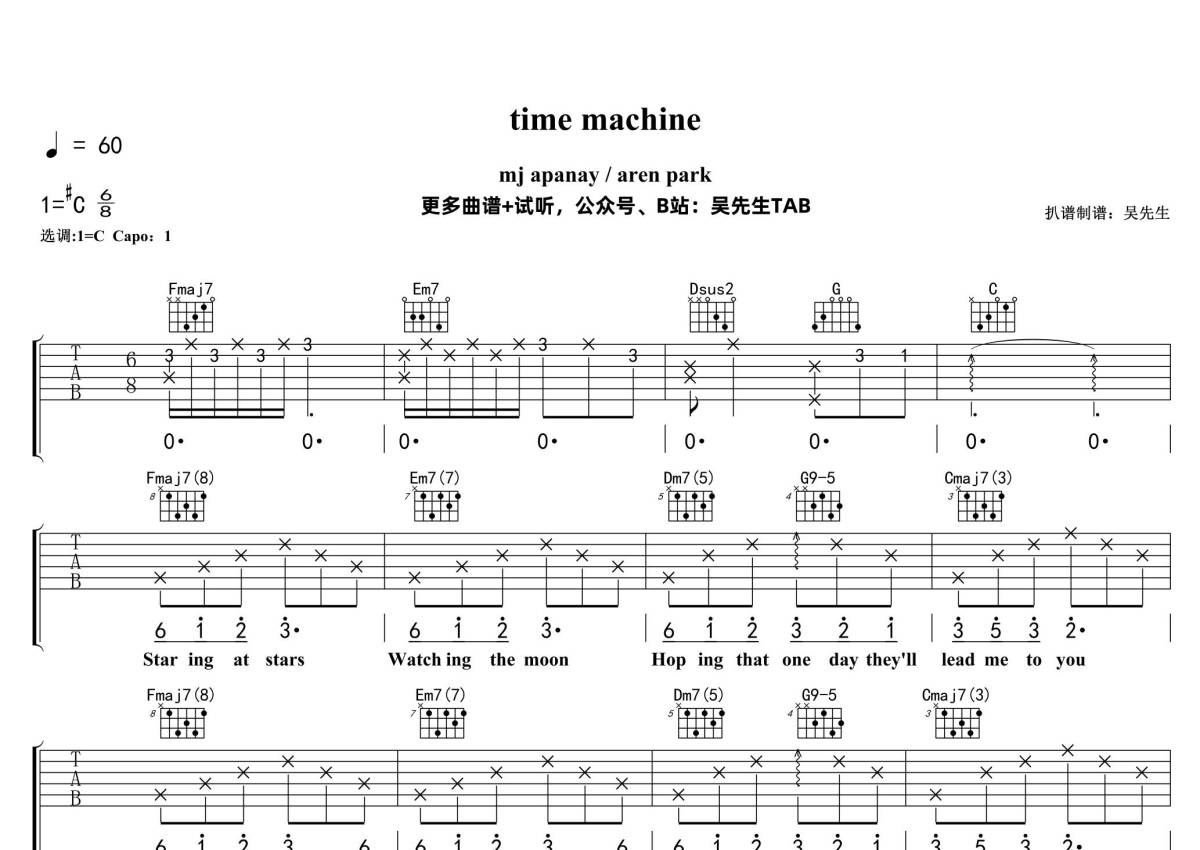 《time machine》是mj apanay / aren park演唱的一首歌曲,拍号为4/4拍,歌曲速度为每分钟60拍,歌曲原调为Db调,但由于原调指法比较难,为了方便弹奏,本吉他谱采用的是C调指法编配,变调夹1品弹奏即为原调,当然也可以根据自己的音域改变变调夹位置,或者通过改变和弦调性,以方便自己弹奏,这份吉他谱共有三张高清图谱,图谱由 @吴先生TAB 编配上传,图谱使用六线谱编配,包含吉他和弦指法、简谱以及歌词部分,曲谱配备了相关的音频提供试听,使用这份time machine吉他谱,可以让你更加方便地掌握这首歌曲的弹唱技巧,快来尝试吧。