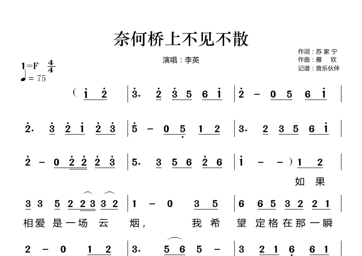 《奈何桥上不见不散》是李英演唱的一首歌曲,这份简谱共有两张高清图谱,图谱由 @音乐伙伴 编配上传。
