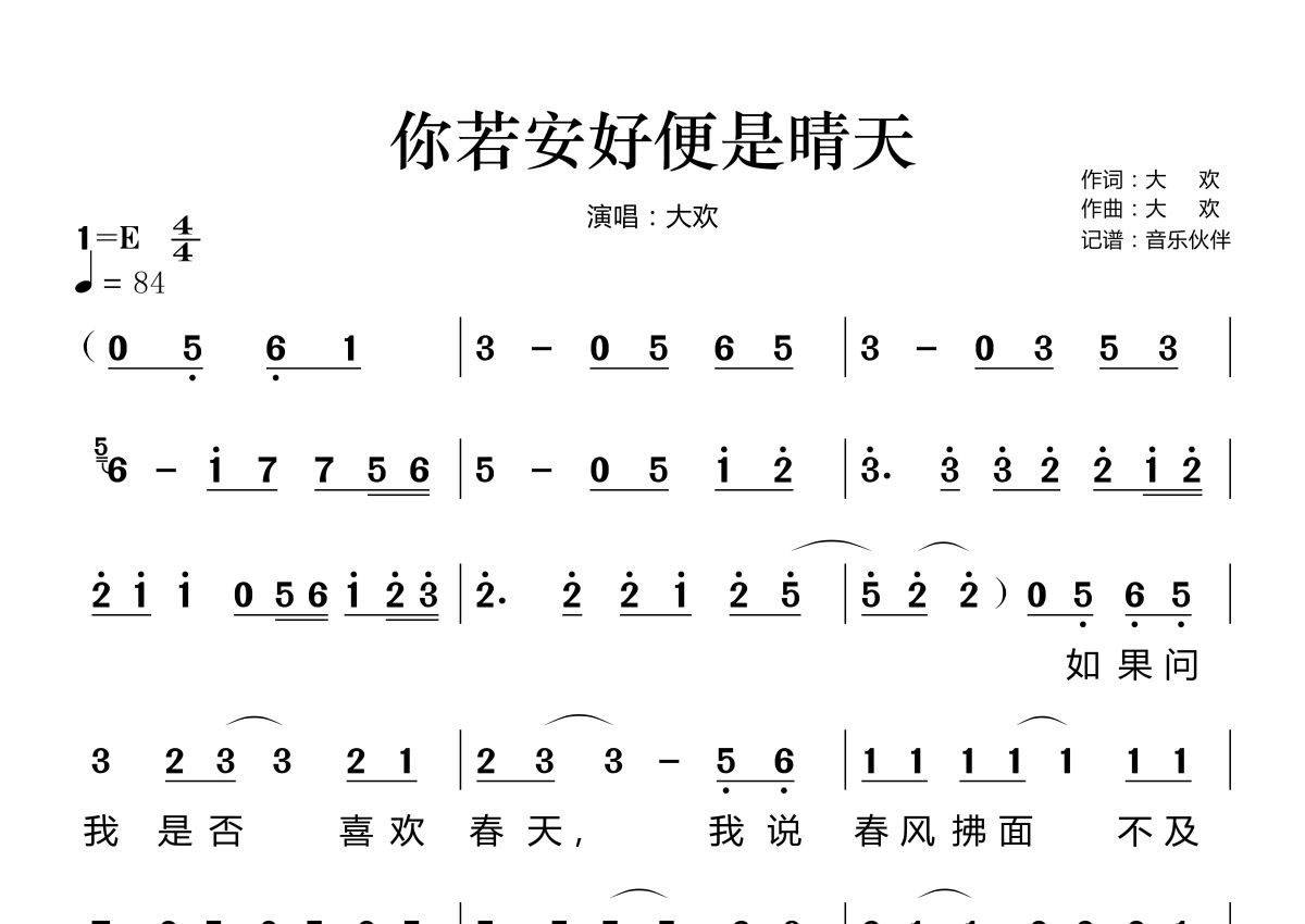 《你若安好便是晴天》是大欢演唱的一首歌曲,这份简谱共有两张高清图谱,图谱由 @音乐伙伴 编配上传。