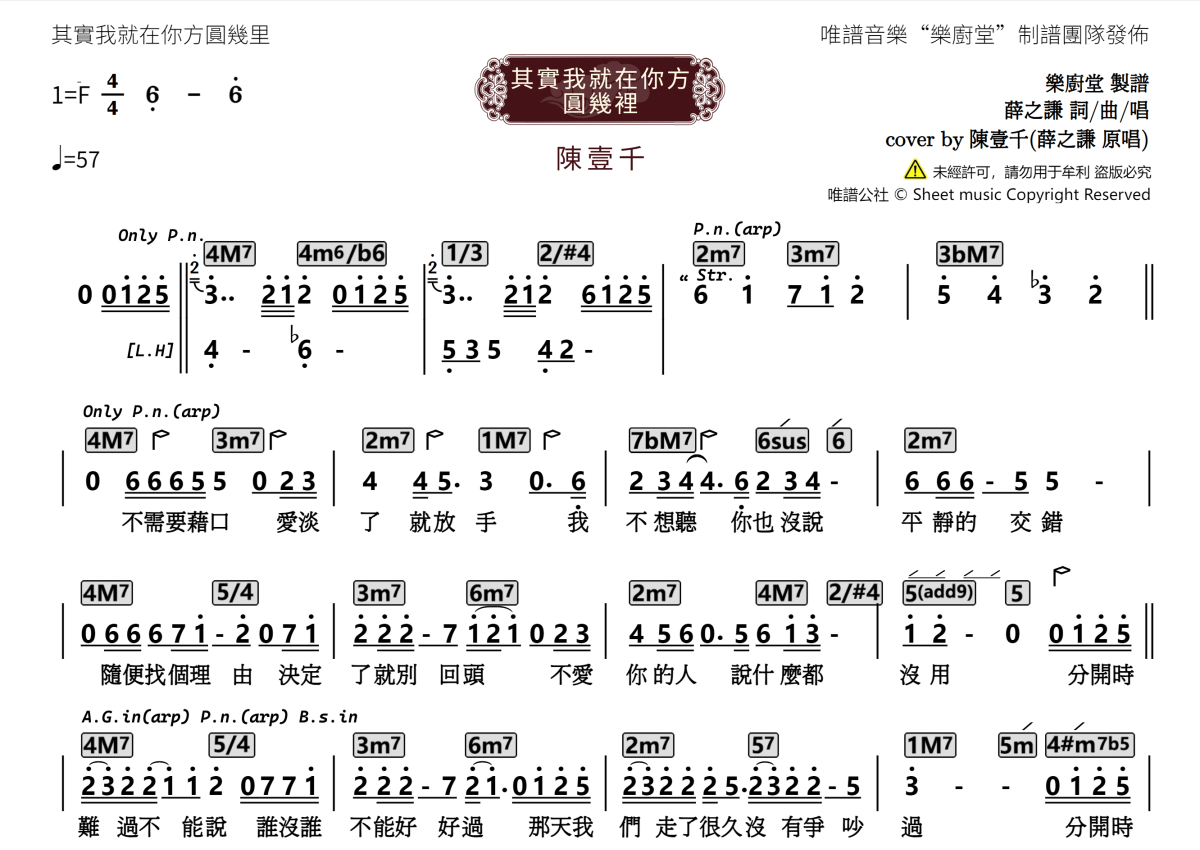 《其实我就在你方圆几里》是陈壹千演唱的一首歌曲,这份简谱共有两张高清图谱,图谱由 @唯谱音乐"乐厨堂"发布小组 编配上传职业LIVE乐手伴奏专用谱,同时适合四大件配置乐队排练和专业歌手学歌,以及原版的应急演出即兴伴奏使用。