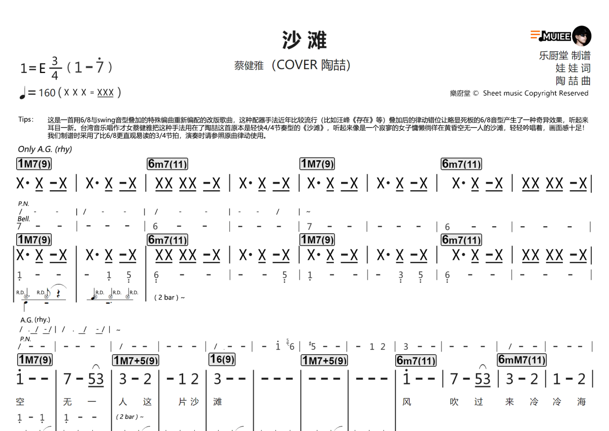 《沙滩》是蔡健雅演唱的一首歌曲,拍号为4/4拍,这份简谱共有三张高清图谱,图谱由 @乐厨堂 编配上传职业LIVE乐手伴奏专用谱,同时适合四大件配置乐队排练和专业歌手学歌,以及原版的应急演出即兴伴奏使用。