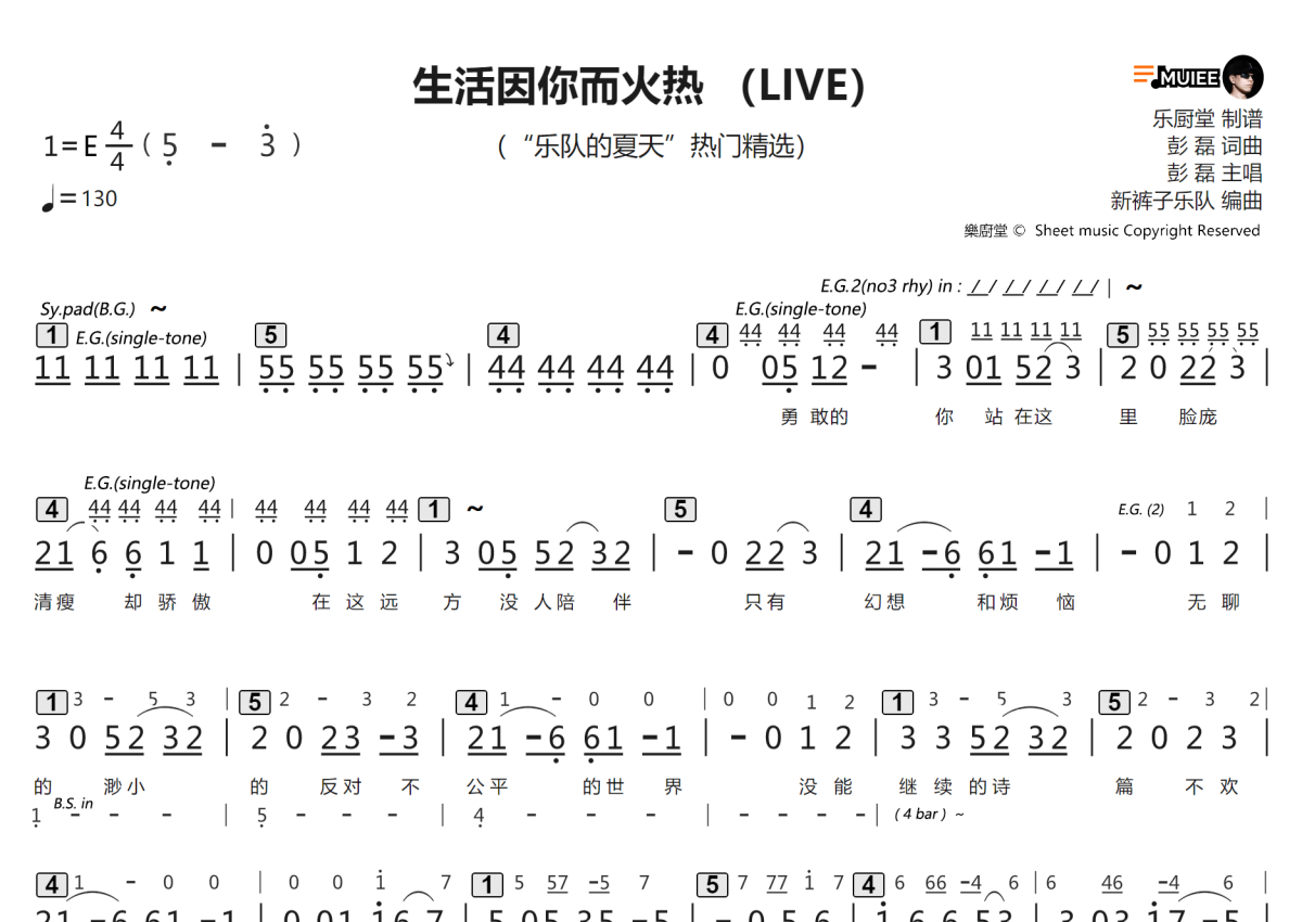 《生活因你而火热》是新裤子乐队演唱的一首歌曲,拍号为4/4拍,这份简谱共有三张高清图谱,图谱由 @乐厨堂 编配上传职业LIVE乐手伴奏专用谱,同时适合四大件配置乐队排练和专业歌手学歌,以及原版的应急演出即兴伴奏使用。
