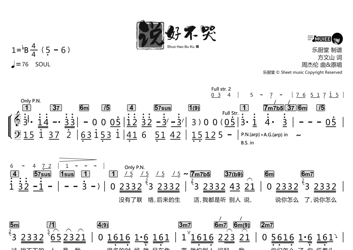 《说好不哭》是周杰伦演唱的一首歌曲,拍号为4/4拍,这份简谱共有两张高清图谱,图谱由 @乐厨堂 编配上传职业LIVE乐手伴奏专用谱,同时适合四大件配置乐队排练和专业歌手学歌,以及原版的应急演出即兴伴奏使用。