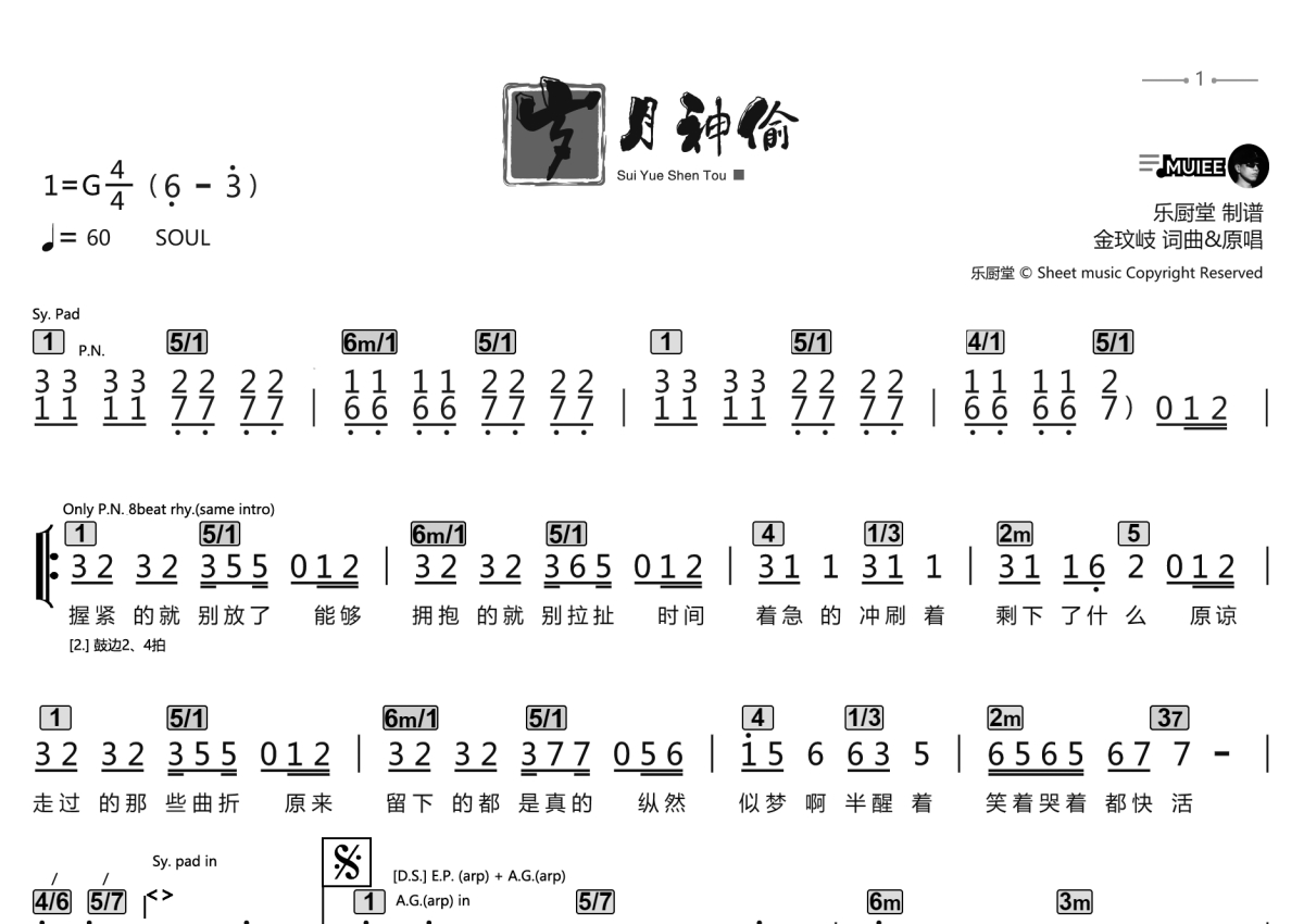 《岁月神偷》是金玟岐演唱的一首歌曲,这份简谱共有两张高清图谱,图谱由 @乐厨堂 编配上传职业LIVE乐手伴奏专用谱,同时适合四大件配置乐队排练和专业歌手学歌,以及原版的应急演出即兴伴奏使用。