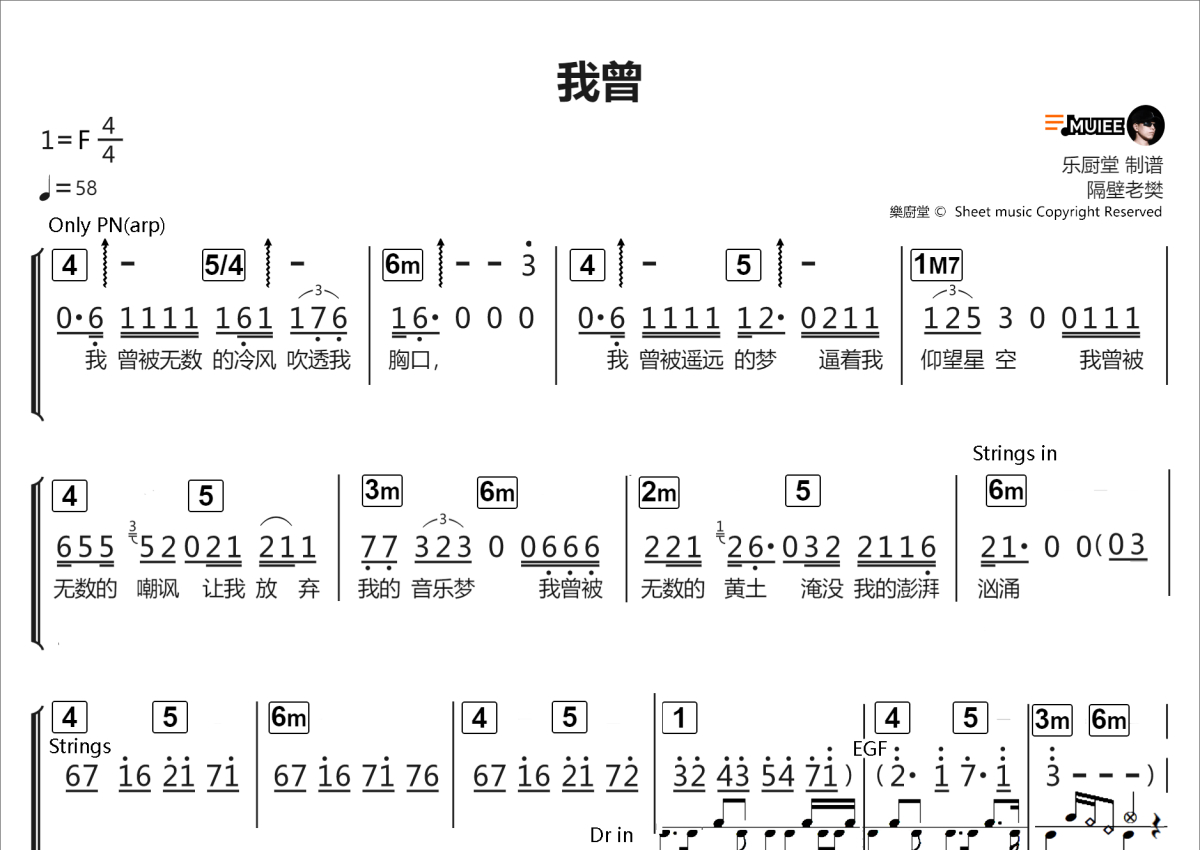 《我曾》是隔壁老樊演唱的一首歌曲,拍号为4/4拍,这份简谱共有两张高清图谱,图谱由 @乐厨堂 编配上传职业LIVE乐手伴奏专用谱,同时适合四大件配置乐队排练和专业歌手学歌,以及原版的应急演出即兴伴奏使用。