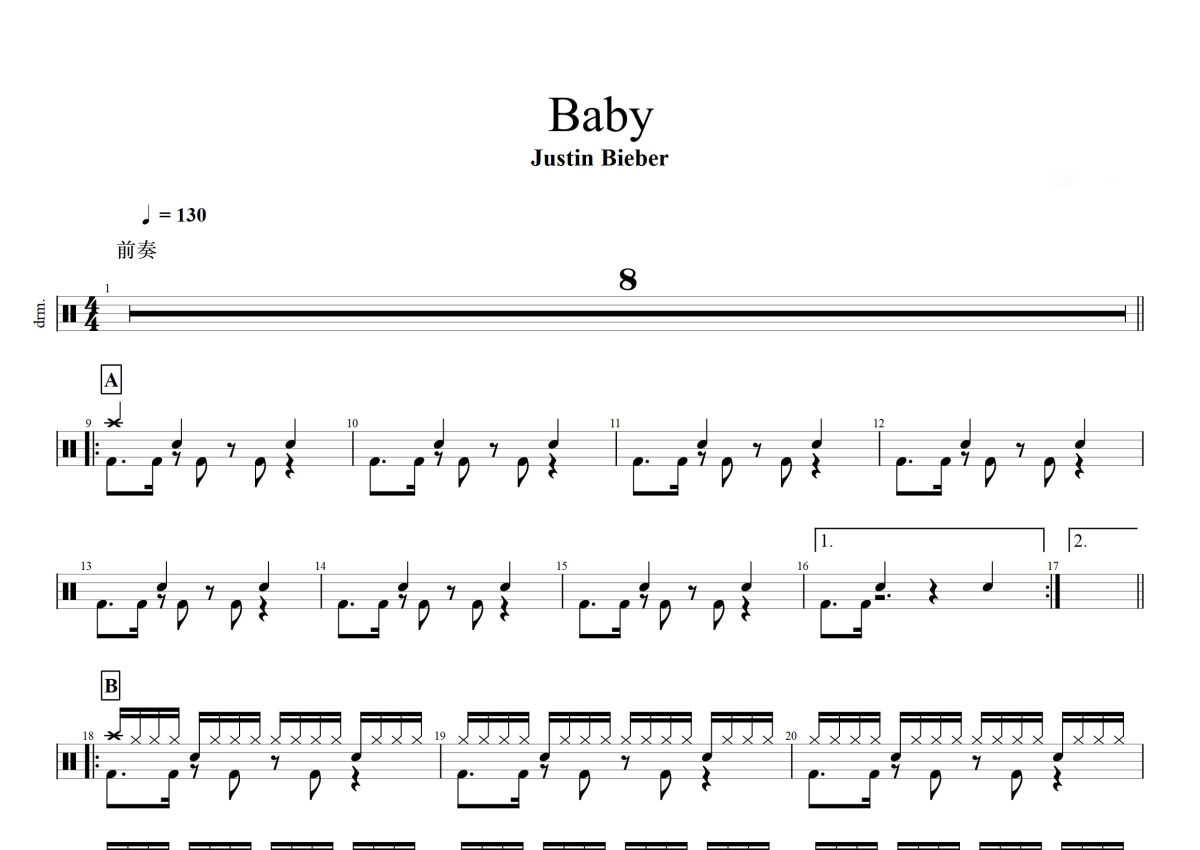 《Baby》是Justin Bieber演唱的一首歌曲,这份鼓谱共有两张高清图谱,图谱由 @打鼓谱 编配上传,图谱使用五线谱编配,使用这份Baby架子鼓谱,你将能够轻松地敲打出这首Justin Bieber的Baby,快来尝试吧。《Baby》是加拿大男歌手贾斯汀·比伯演唱的一首流行歌曲,歌词、曲谱由贾斯汀·比伯、卢达·克里斯、The-Dream、Tricky Stewart、克里斯蒂娜·米兰制作完成 [1] 。该歌曲作为推广其所属专辑的首波单曲,于2010年1月18日通过小岛唱片公司发布 ,收录在贾斯汀·比伯于2010年1月18日发行的首张录音室专辑《My World 2.0》。