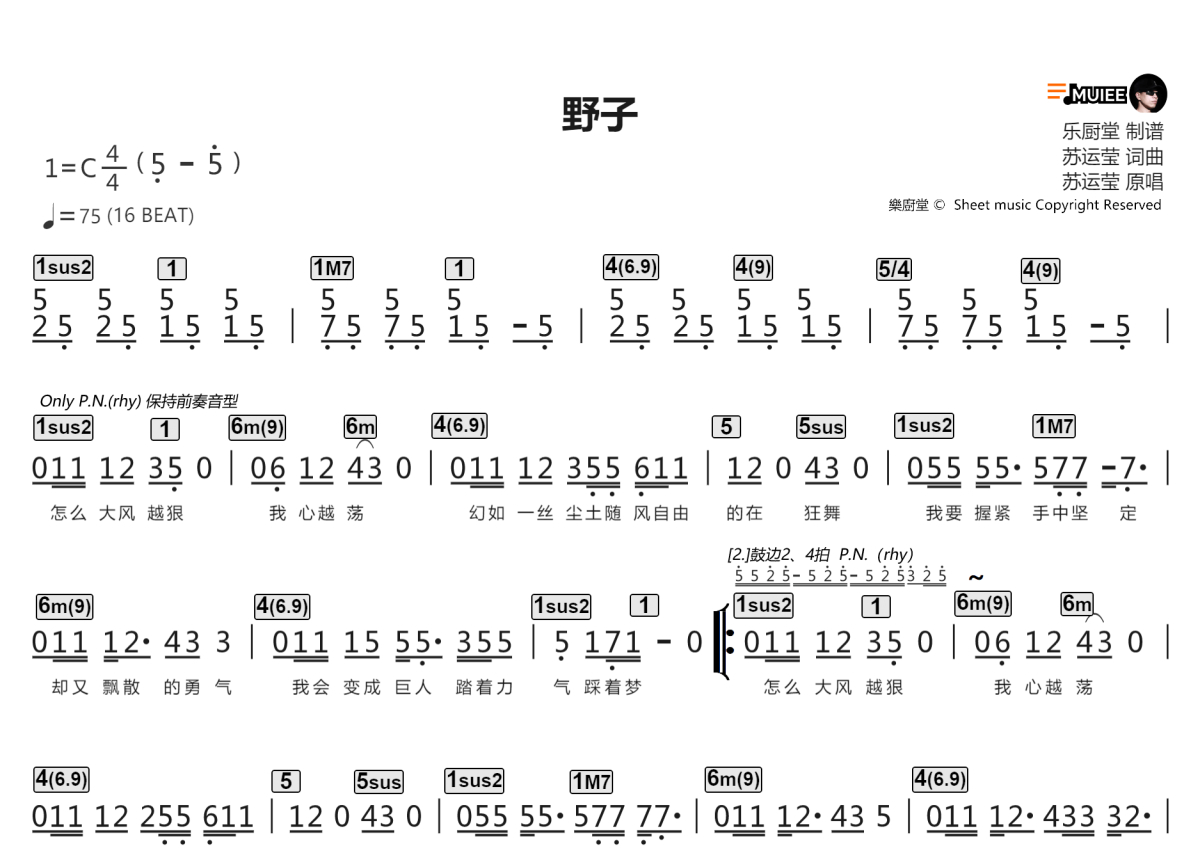 《野子》是苏运莹演唱的一首歌曲,这份简谱共有两张高清图谱,图谱由 @乐厨堂 编配上传职业LIVE乐手伴奏专用谱,同时适合四大件配置乐队排练和专业歌手学歌,以及原版的应急演出即兴伴奏使用。