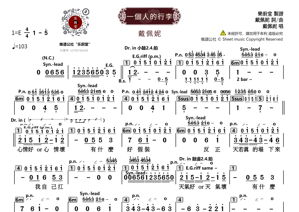 “乐厨堂”乐谱发布小组: 出版级乐谱扒谱制谱——以职业乐手圈通行标准记谱,遵循原版和声、伴奏元素和段落结构。 ❶ 2.0多功能专业团谱:采用台湾卓著公司开创的二代简谱标准制作。二代简谱无疑是迄今为止最科学、最易读的专业范畴多功能记谱方案:❷ 框架谱:采用职业乐手通常记谱方案制作。