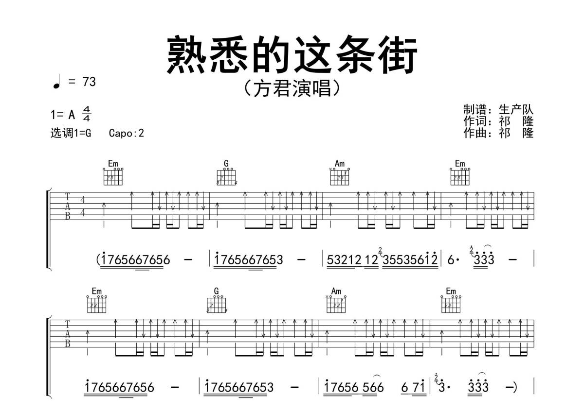 《熟悉的这条街》是方君演唱的一首歌曲,精编扫弦版,拍号为4/4拍,歌曲速度为每分钟73拍,歌曲原调为A调,但由于原调指法比较难,为了方便弹奏,本吉他谱采用的是G调指法编配,变调夹2品弹奏即为原调,当然也可以根据自己的音域改变变调夹位置,或者通过改变和弦调性,以方便自己弹奏,这份吉他谱共有三张高清图谱,图谱由 @生产队 编配上传,图谱使用六线谱编配,包含吉他和弦指法、简谱以及歌词部分,使用这份熟悉的这条街吉他谱,可以让你更加方便地掌握这首歌曲的弹唱技巧,快来尝试吧。《熟悉的这条街》是由歌手方君演唱的最新单曲。本吉他谱根据原版G调指法扫弦节奏编配,完整的前奏、间奏和solo。繁华都市的午夜,走在这条熟悉的街,看着都市的霓虹,可是你我已离别。