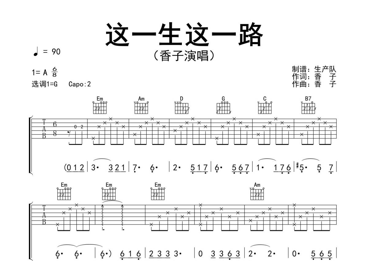 《这一生这一路》是香子演唱的一首歌曲,精编完美版,拍号为6/8拍,歌曲速度为每分钟90拍,歌曲原调为A调,但由于原调指法比较难,为了方便弹奏,本吉他谱采用的是G调指法编配,变调夹2品弹奏即为原调,当然也可以根据自己的音域改变变调夹位置,或者通过改变和弦调性,以方便自己弹奏,这份吉他谱共有三张高清图谱,图谱由 @生产队 编配上传,图谱使用六线谱编配,包含吉他和弦指法、简谱以及歌词部分,使用这份这一生这一路吉他谱,可以让你更加方便地掌握这首歌曲的弹唱技巧,快来尝试吧。《这一生这一路》是由歌手香子创作并演唱的最新单曲。本吉他谱根据原版G调指法编配,完整的前奏、间奏、尾奏和solo编配。这一路匆匆忙忙又慌慌张张,未曾欣赏那沿途风光,这一生坎坎坷坷又跌跌撞撞,到了最后看人间沧桑。