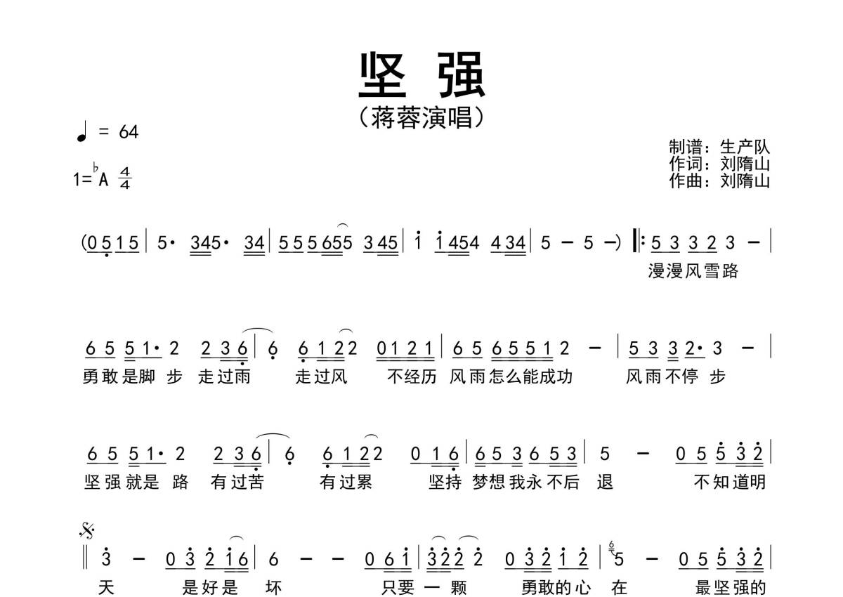 《坚强》是蒋蓉演唱的一首歌曲,原版简谱,拍号为4/4拍,歌曲速度为每分钟64拍,这份简谱共有一张高清图谱,图谱由 @生产队 编配上传蒋蓉演唱的歌曲《坚强》原版简谱。