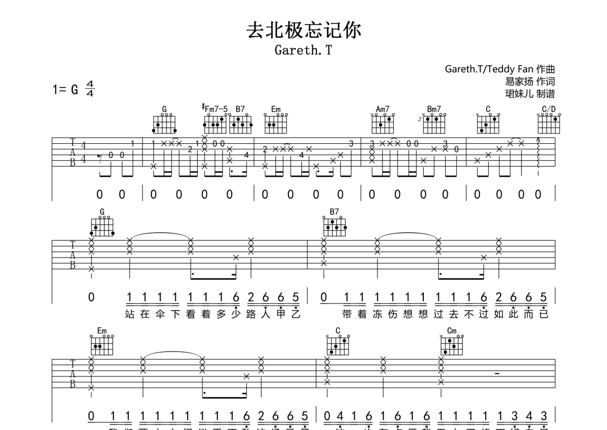 去北极忘记你吉他谱 - Gareth.T - G调弹唱六线谱