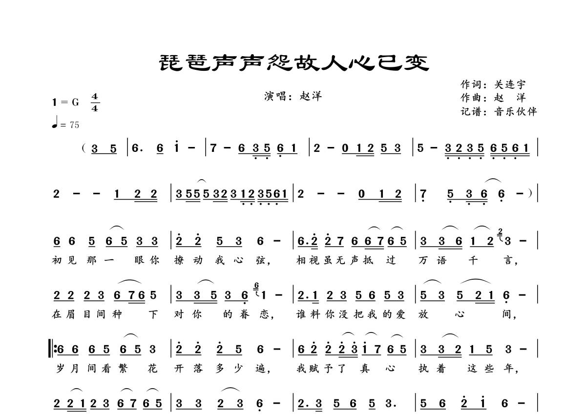《琵琶声声怨故人心已变》是赵洋演唱的一首歌曲,拍号为4/4拍,歌曲速度为每分钟75拍,这份简谱共有一张高清图谱,图谱由 @音乐伙伴 编配上传。