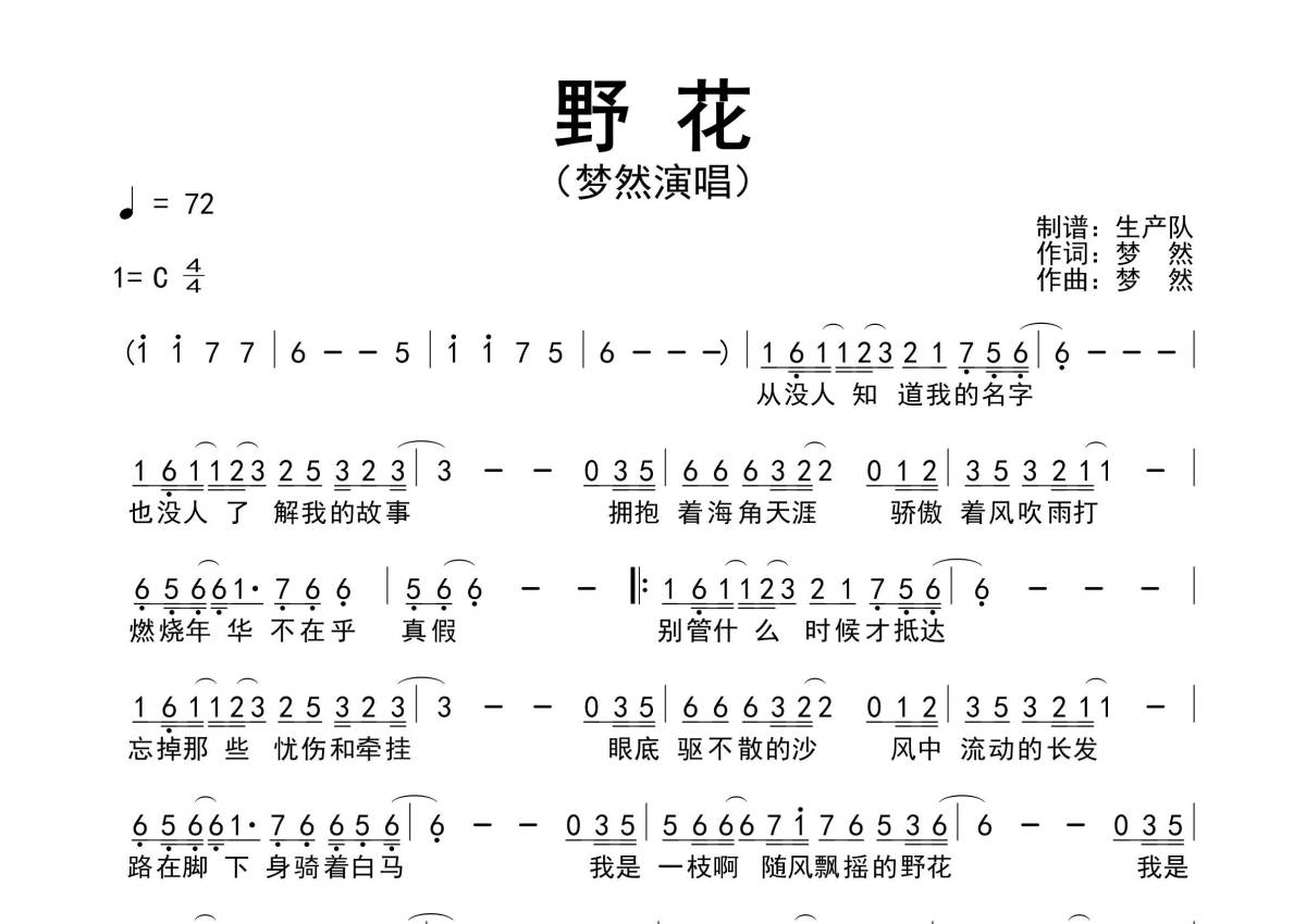 《野花》是梦然演唱的一首歌曲,原版简谱,拍号为4/4拍,歌曲速度为每分钟72拍,这份简谱共有一张高清图谱,图谱由 @生产队 编配上传梦然创作并演唱的最新单曲《野花》原版简谱。