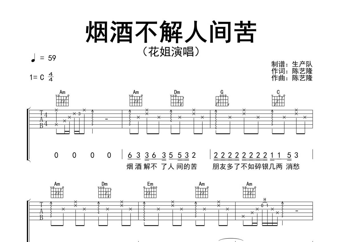 《烟酒不解人间苦》是花姐演唱的一首歌曲,精编完美版,拍号为4/4拍,歌曲速度为每分钟59拍,歌曲原调为C调,本吉他谱采用的是C调指法编配,演奏时不需要使用变调夹即为原调,这份吉他谱共有两张高清图谱,图谱由 @生产队 编配上传,图谱使用六线谱编配,包含吉他和弦指法、简谱以及歌词部分,使用这份烟酒不解人间苦吉他谱,可以让你更加方便地掌握这首歌曲的弹唱技巧,快来尝试吧。《烟酒不解人间苦》是由花姐最新推出的歌曲。本吉他谱根据原版C调指法编配,含间奏和solo编配。烟酒做了朋友烟酒解不了人间的苦,朋友多了不如碎银几两消愁。烟抽完酒倒满再不回头,千言万语难挽回走过的路。