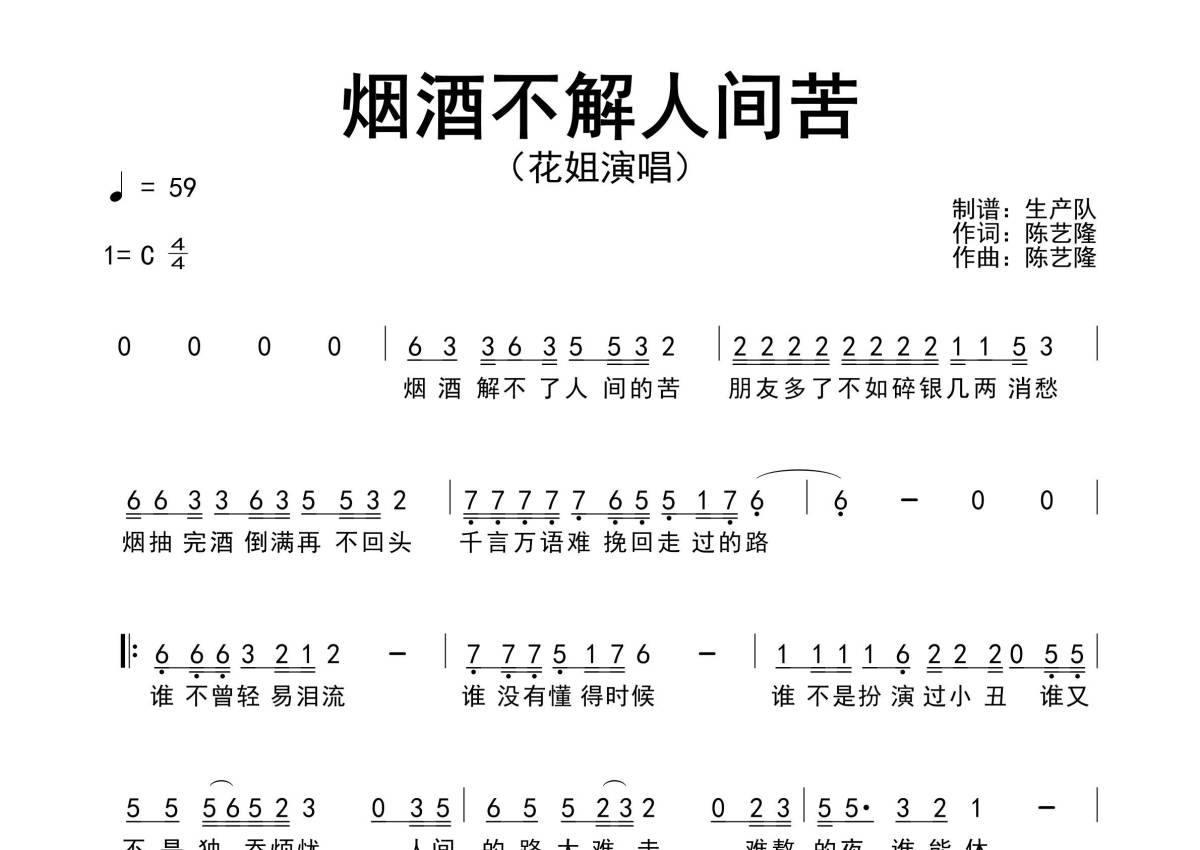 《烟酒不解人间苦》是花姐演唱的一首歌曲,原版简谱,拍号为4/4拍,歌曲速度为每分钟59拍,这份简谱共有一张高清图谱,图谱由 @生产队 编配上传花姐演唱的歌曲《烟酒不解人间苦》原版简谱。