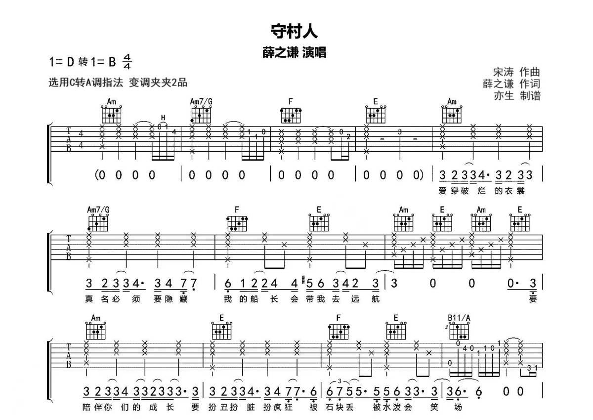 《守村人》是薛之谦演唱的一首歌曲,拍号为4/4拍,歌曲原调为D调,但由于原调指法比较难,为了方便弹奏,本吉他谱采用的是C调指法编配,变调夹2品弹奏即为原调,当然也可以根据自己的音域改变变调夹位置,或者通过改变和弦调性,以方便自己弹奏,这份吉他谱共有两张高清图谱,图谱由 @亦生 编配上传,图谱使用六线谱编配,包含吉他和弦指法、简谱以及歌词部分,使用这份守村人吉他谱,可以让你更加方便地掌握这首歌曲的弹唱技巧,快来尝试吧。