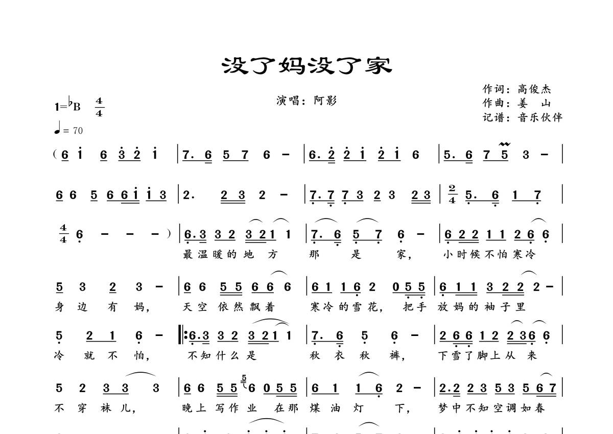 《没了妈没了家》是阿影演唱的一首歌曲,拍号为4/4拍,歌曲速度为每分钟70拍,这份简谱共有一张高清图谱,图谱由 @音乐伙伴 编配上传。