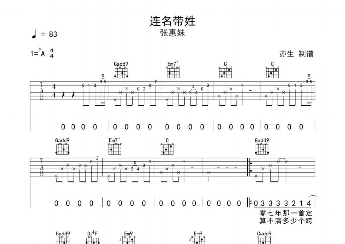 《连名带姓》是张惠妹演唱的一首歌曲,拍号为4/4拍,歌曲原调为G调,本吉他谱采用的是G调指法编配,变调夹1品弹奏即为原调,当然也可以根据自己的音域改变变调夹位置,或者通过改变和弦调性,以方便自己弹奏,这份吉他谱共有四张高清图谱,图谱由 @亦生 编配上传,图谱使用六线谱编配,包含吉他和弦指法、简谱以及歌词部分,使用这份连名带姓吉他谱,可以让你更加方便地掌握这首歌曲的弹唱技巧,快来尝试吧。