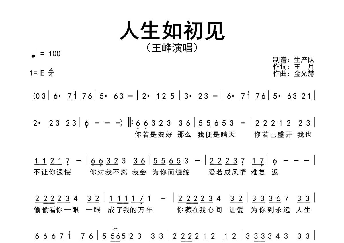 《人生如初见》是王峰演唱的一首歌曲,原版简谱,拍号为4/4拍,歌曲速度为每分钟100拍,这份简谱共有一张高清图谱,图谱由 @生产队 编配上传王峰演唱的最新单曲《人生如初见》原版简谱。