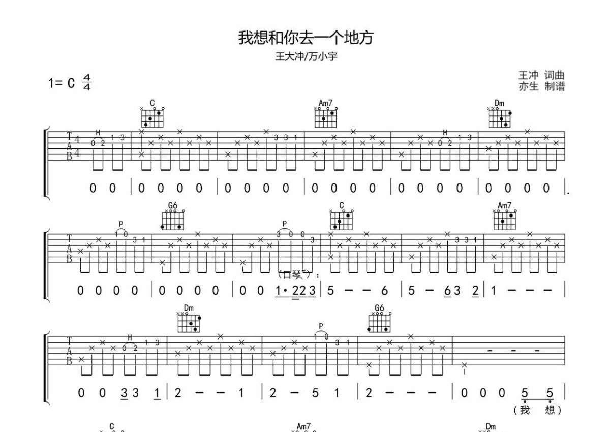 王大冲/万小宇《我想和你去一个地方》吉他谱 - C调弹唱六线谱