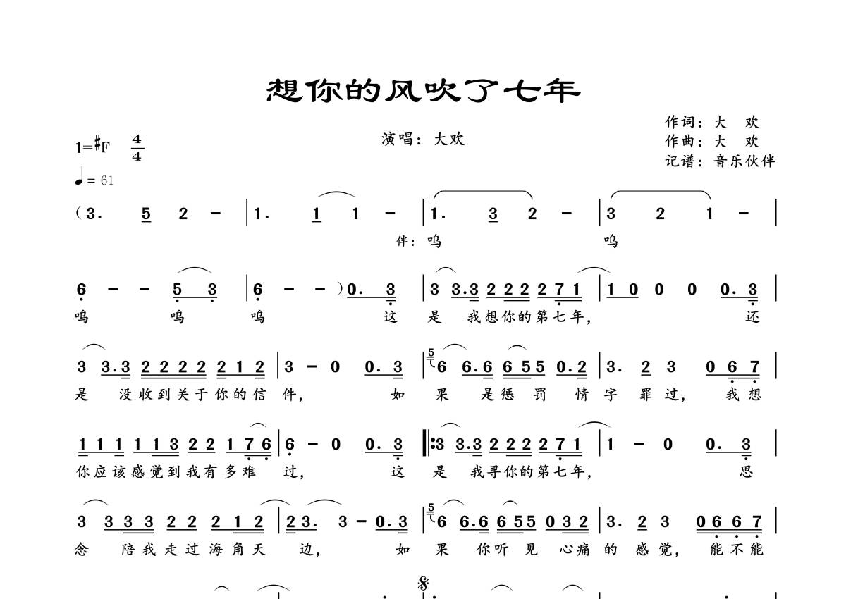 《想你的风吹了七年》是大欢演唱的一首歌曲,拍号为4/4拍,歌曲速度为每分钟61拍,这份简谱共有一张高清图谱,图谱由 @音乐伙伴 编配上传。