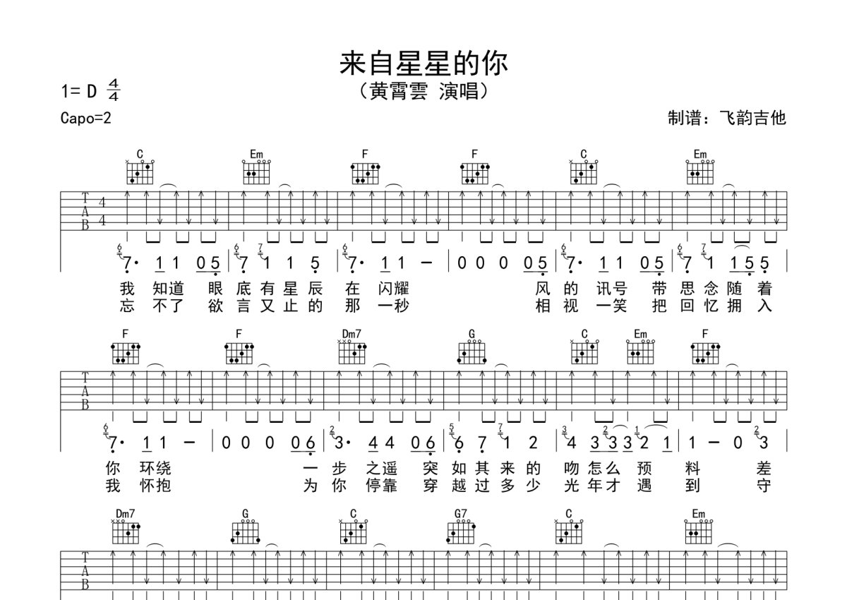 黄霄雲《来自星星的你》吉他谱 - C调弹唱六线谱