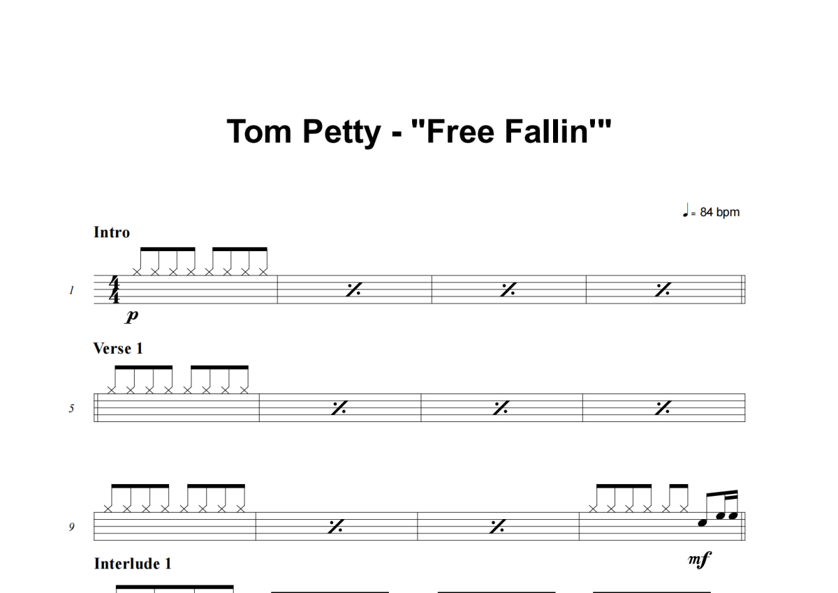 《Free Fallin》是Tom Petty演唱的一首歌曲,歌曲速度为每分钟84拍,这份架子鼓谱共有三张高清图谱,图谱由 @司空千落 编配上传,图谱使用五线谱编配,使用这份Free Fallin架子鼓谱,你将能够轻松地敲打出这首Tom Petty的Free Fallin,快来尝试吧。